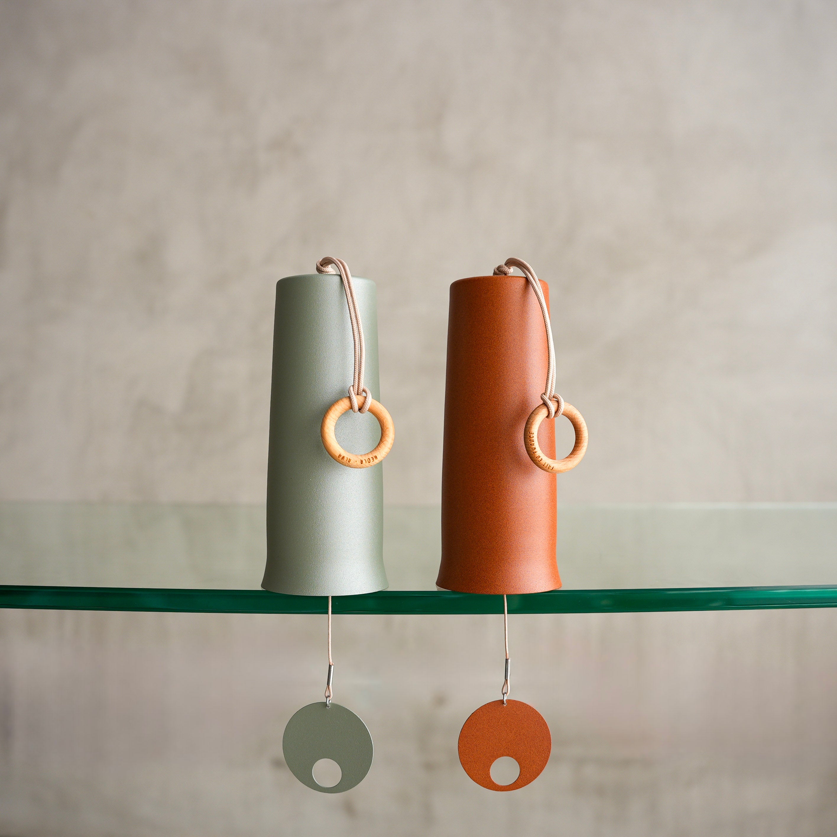 This set includes two handcrafted wind chimes.